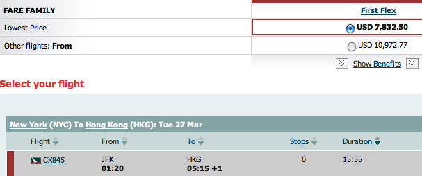 Flight: JFK (New York) nonstop to HKG (Hong Kong) departing on March 27, 2012.