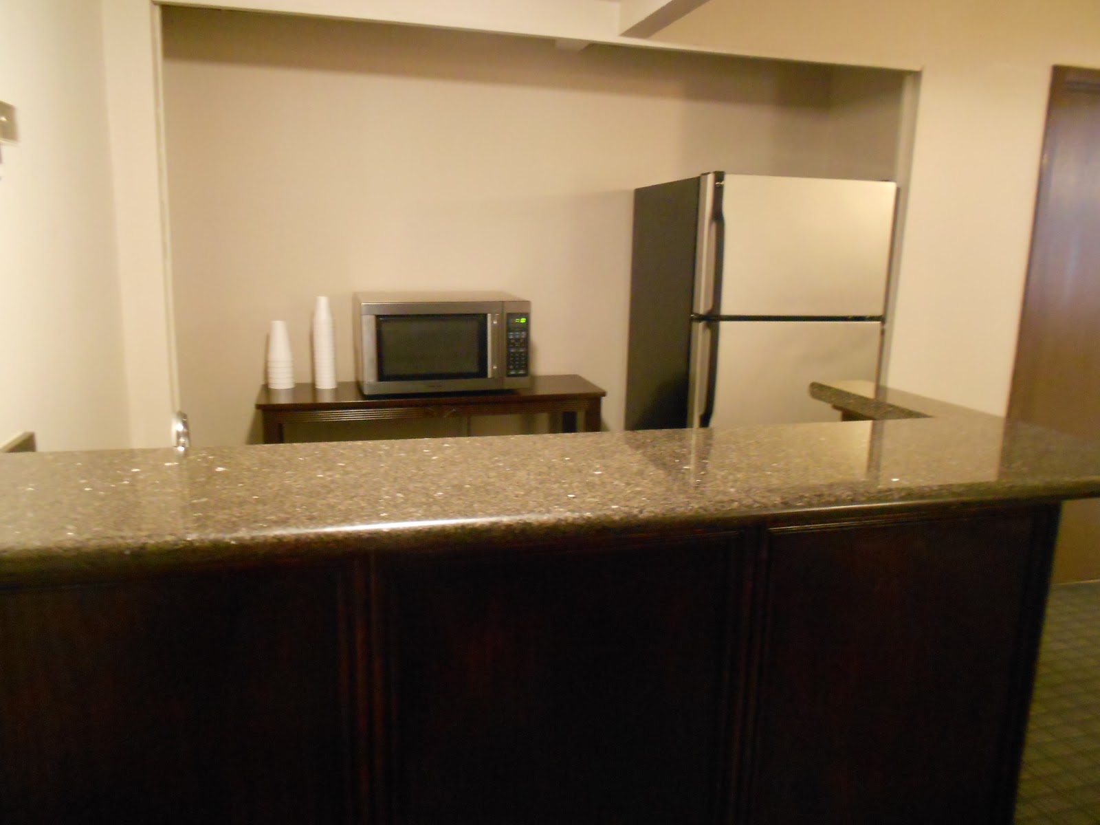 When we opened our door to our room, we were incredibly impressed with the size of our suite. No wonder why they call this the townhouse suite – it was definitely designed to be a nice home away from home, with separate rooms and lots of living space. Our suite included a huge king sized bed, 2 desks (one equip with a desktop computer), a dining room, a full-sized living room with a flat screen TV, a bar/kitchen area, two full bathrooms and plenty of closet space.