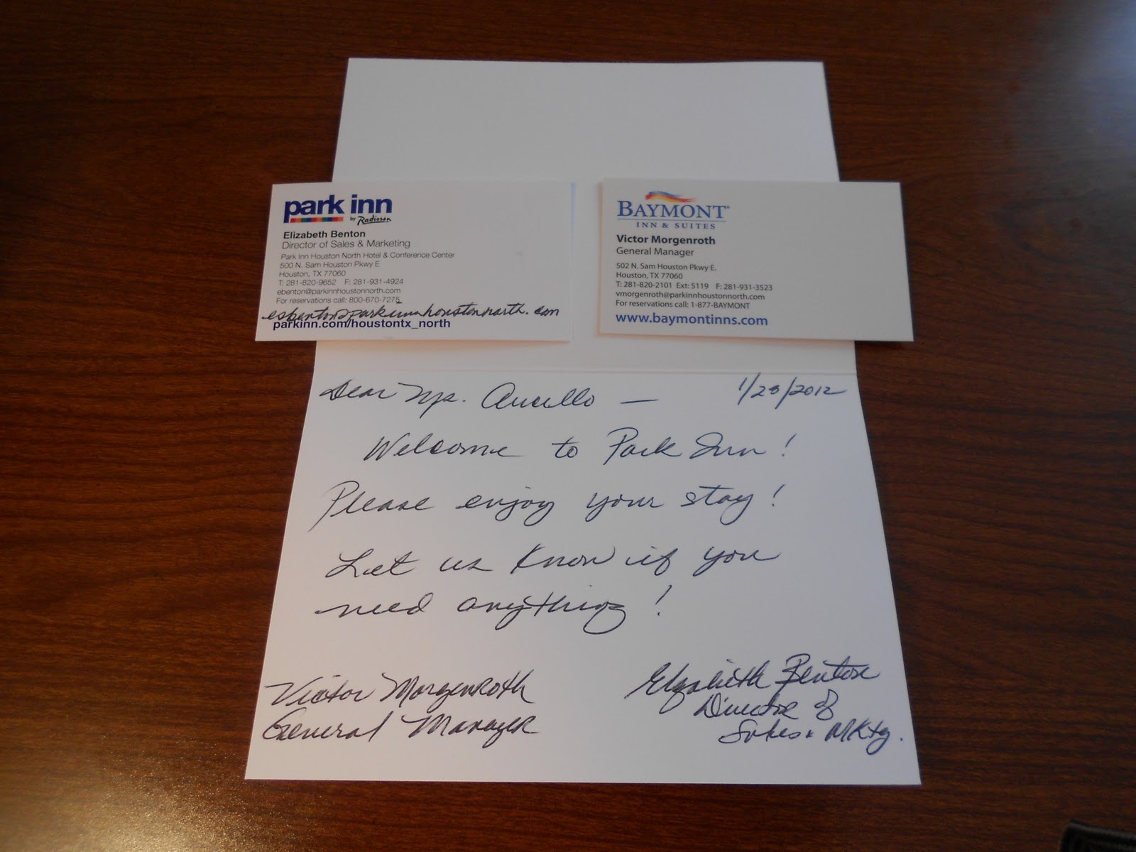 | A beautiful hand-written card from Victor and Elizabeth of the hotel’s management! |
